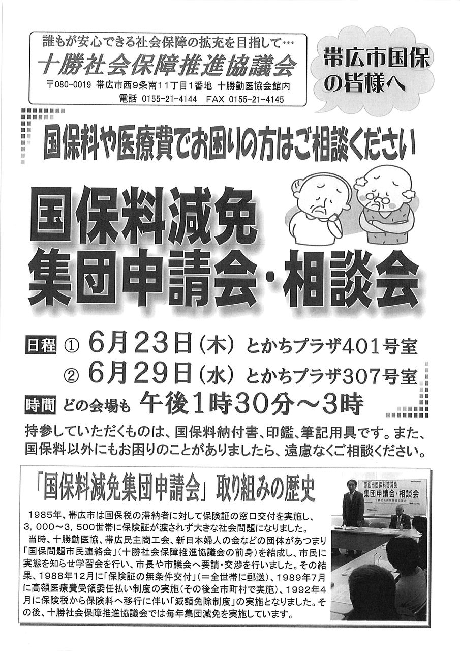 当時、十勝勤医協、帯広民主商工会、新日本婦人の会などの団体が集まり「国保問題市民連絡会」(十勝社会保障推進協義会の前身)を結成し、市民に実態を知らせ学習会を行い、市長や市議会へ要請・交渉を行いました。その結果、1988年12月に「保険証の無条件交付」(=全世帯に郵送)、1989年7月に高額医療費受領委任払い制度の実施(その後全市町村で実施)、1992年4月に保険税から保険料へ移行に伴い「減額免除制度」の実施となりました。その後、十勝社会保障推進協議会では毎年集団減免を実施しています。